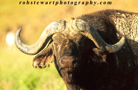 An oxpecker feeds on ticks and flies on an African Buffalo in Kenya
